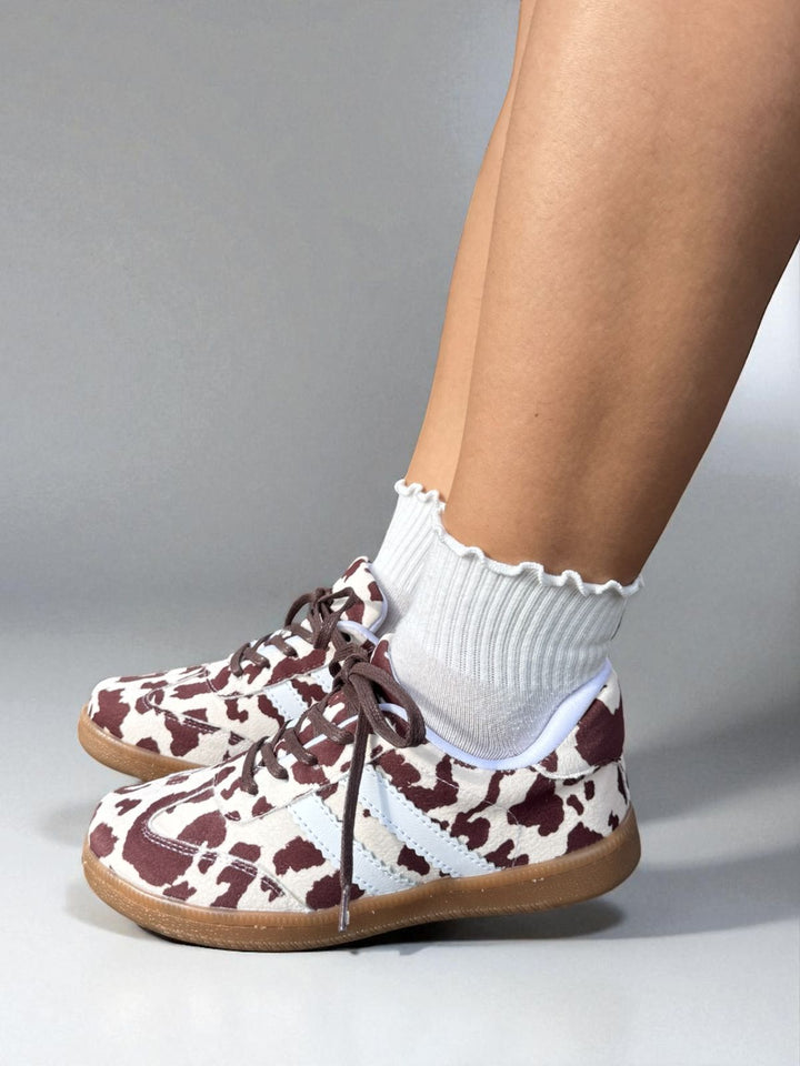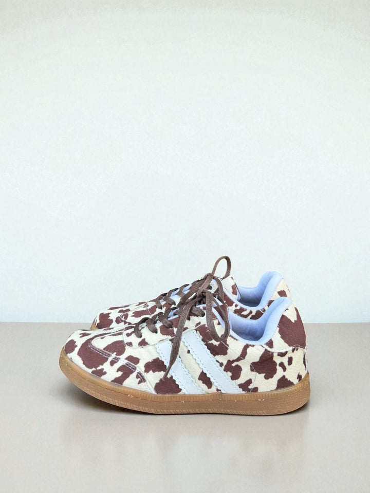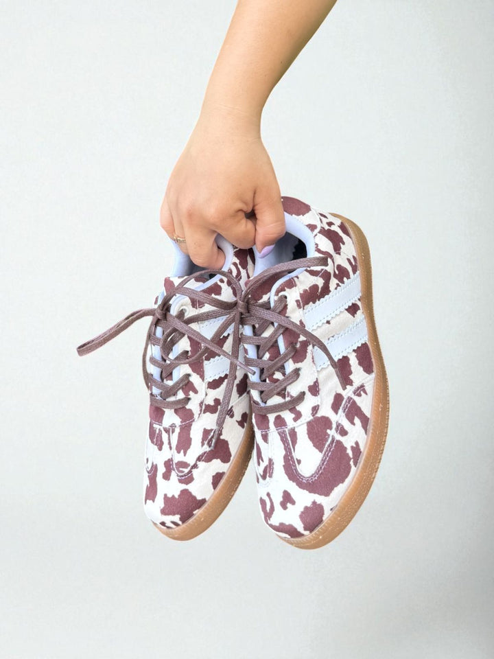 Unos tenis deportivos inspirados en el irresistible estilo cow print, con suela baja, cocidos a mano y tan livianos que sentirás que caminas sobre nubes.